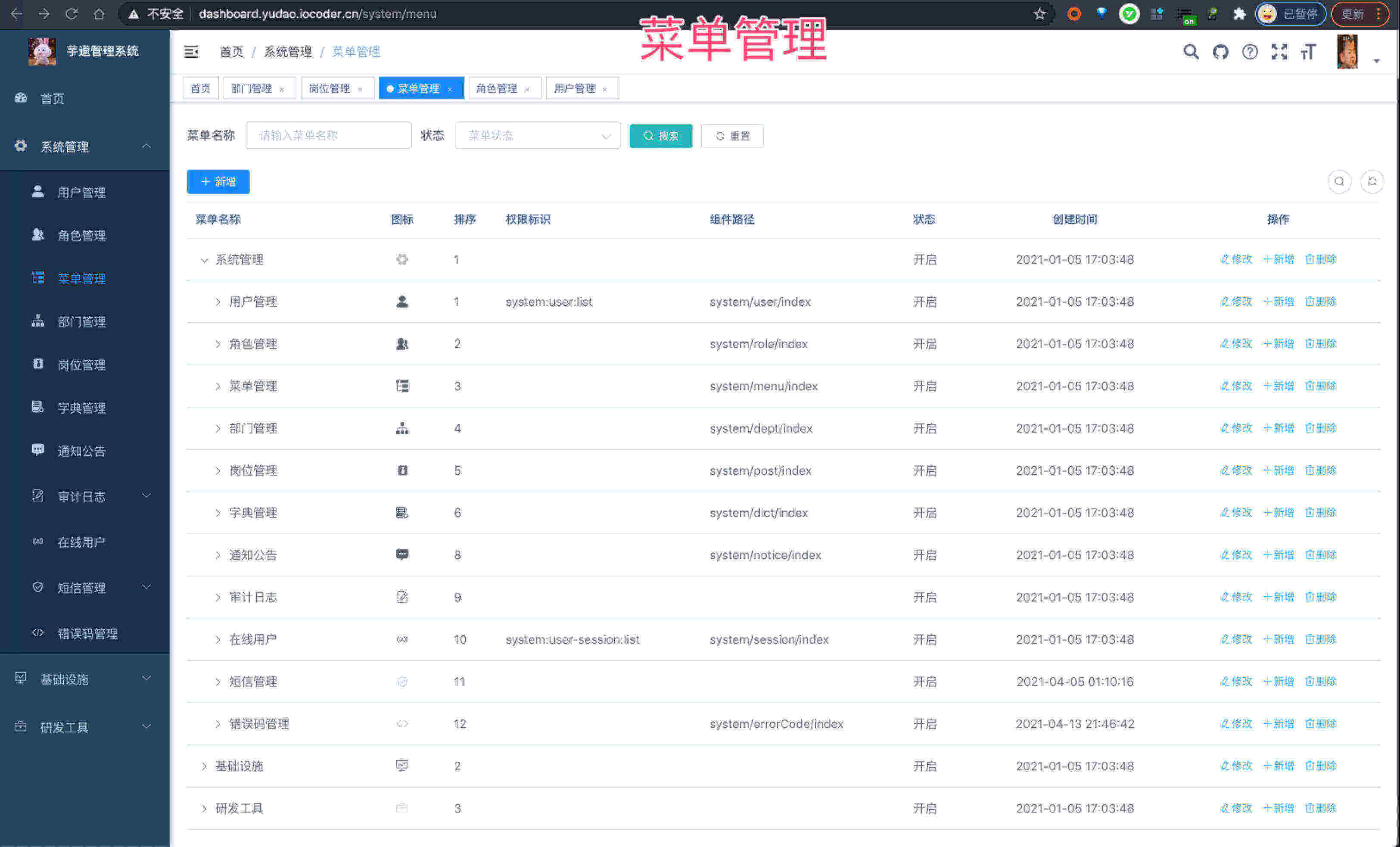 菜单管理 配置系统菜单、操作权限、按钮权限标识等,本地缓存提供性能