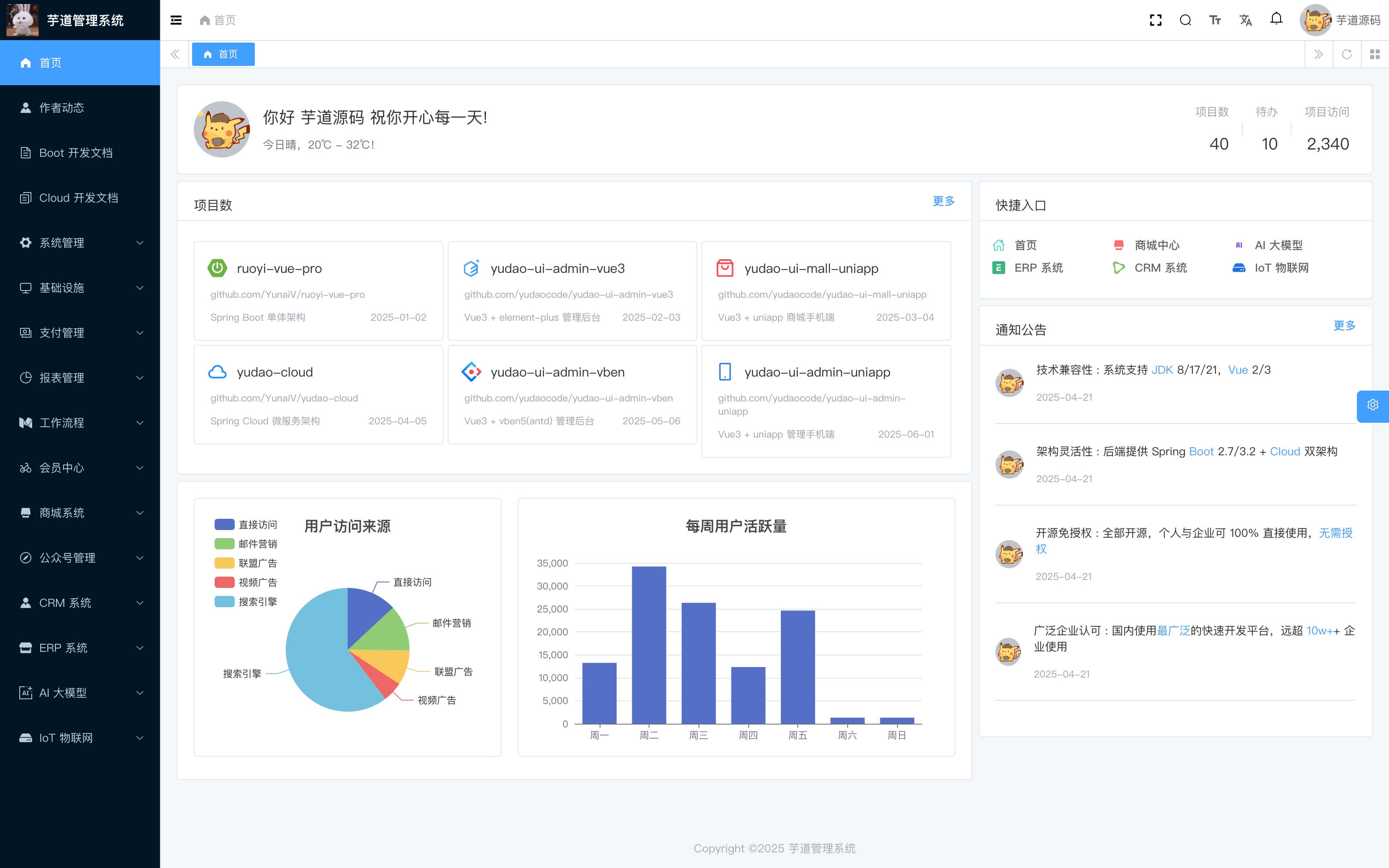 芋道,以开发者为中心,打造中国第一流的快速开发平台,全部开源,个人与企业可 100% 免费使用。